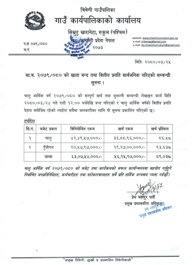 आ.व. २०७९/०८० को खाता बन्द तथा वित्तीय प्रगति सार्वजनिक गरिएको सम्बन्धी सूचना।