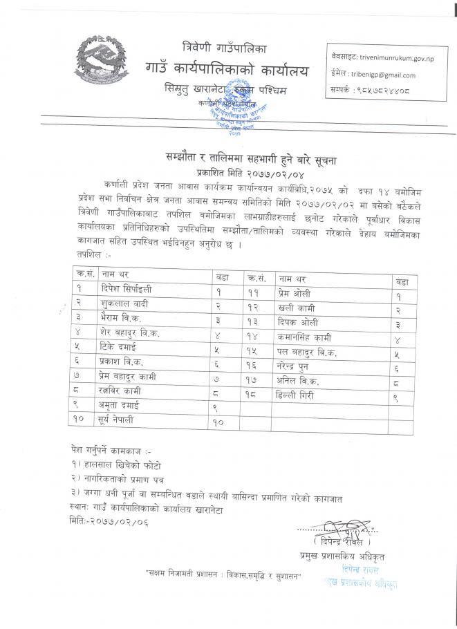 कर्णाली प्रदेश जनता आवास कार्यक्रममा छनौट भएका लाभग्राहीको विवरण र सम्झौता गर्न आउने जानकारीको सुचना ।