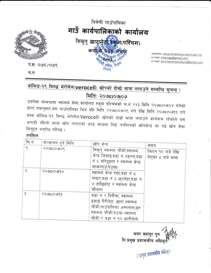 कोभिड-१९ बिरुद्व भेरोसेल खोपको दोस्रो मात्रा लगाउने सम्बन्धि सुचना ।