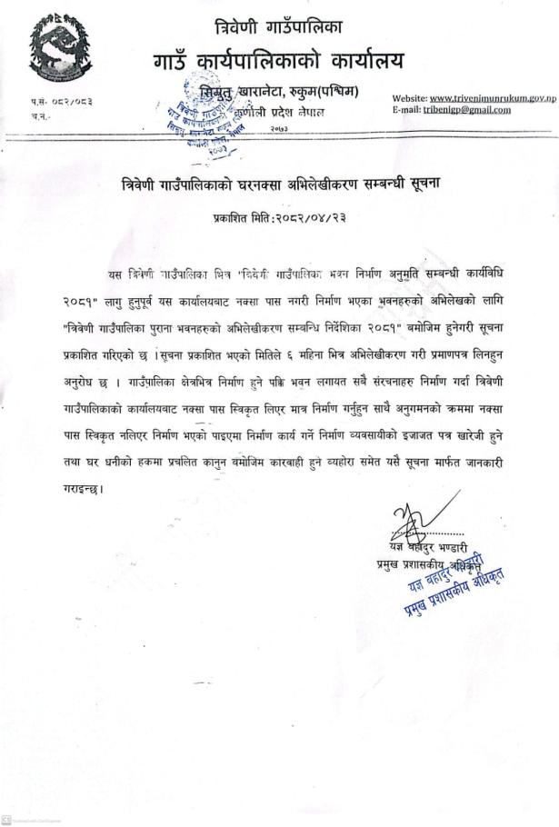 त्रिवेणी गाउँपालिकाको घर नक्सा अभिलेखीकरण सम्बन्धी सूचना।