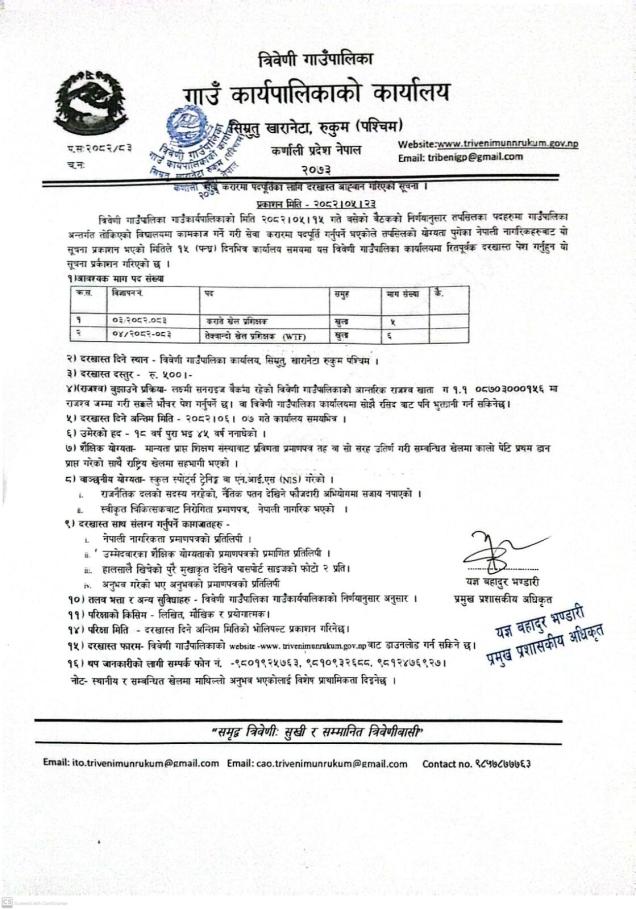 सेवा करारमा पदपुर्तिका लागि दरखास्त आह्वान गरिएको सुचना।