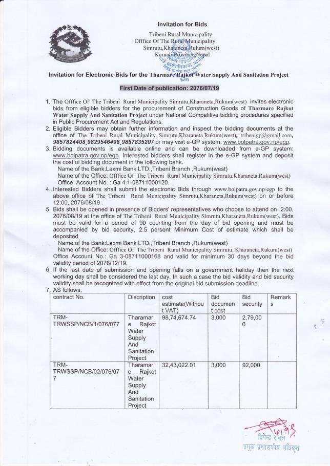 Invitation for Electronic Bids for the Tharmare Rajkot Water Supply and Sanitation Project